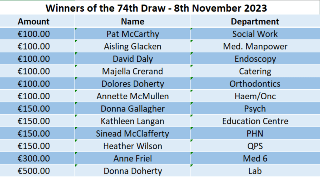 Congratulation to all of the winners of our draw for November 2023. Just to let everyone know that the winners may contact Bernie McGinty at ext – 3508 or bernie.mcginty@hse.ie to collect their cheque. Posted by0860801074mNovember 9, 2023Posted inUncategorized Share this: Click to share on X (Opens in new window) X Click to share on Facebook (Opens in new window) Facebook Like Loading...