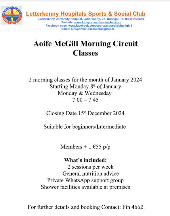 We have new Morning Circuit Classes with Aoife McGill. See poster for further information and details on how to book. Starting in January 2024 but closing date is 15th Dec 2023. Posted by0860801074mNovember 13, 2023Posted inUncategorized Share this: Click to share on X (Opens in new window) X Click to share on Facebook (Opens in new window) Facebook Like Loading...