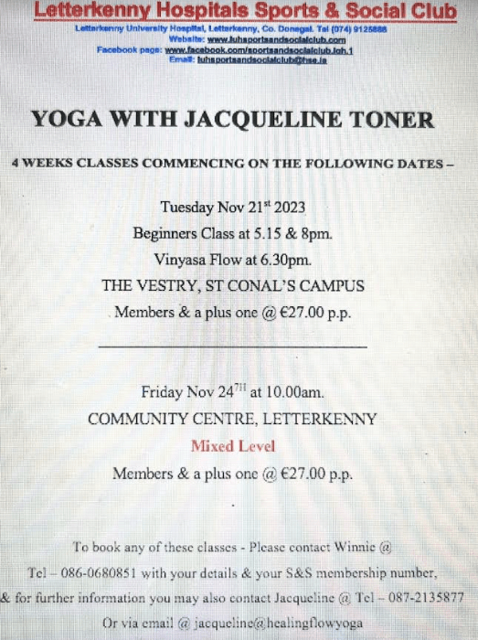 We have Yoga with Jacqueline Toner restarting for November/December in the following venues for 4weeks classes. Please see poster attached for further information & booking details. Posted by0860801074mNovember 14, 2023Posted inUncategorized Share this: Click to share on X (Opens in new window) X Click to share on Facebook (Opens in new window) Facebook Like Loading...