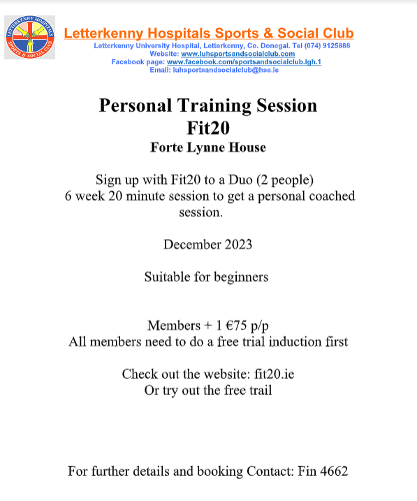 We have Personal Training Sessions available for December with Fit20. See poster attached with further information & booking details. Posted by0860801074mNovember 20, 2023Posted inUncategorized Share this: Click to share on X (Opens in new window) X Click to share on Facebook (Opens in new window) Facebook Like Loading...