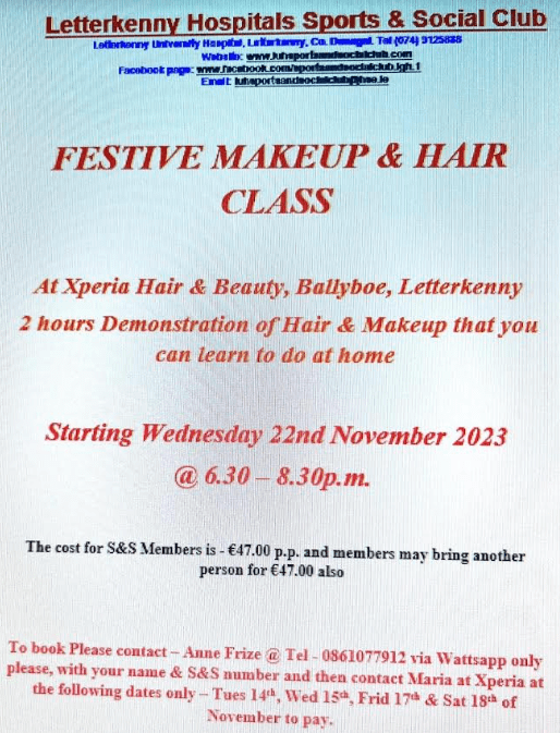 We still have a few spaces left for our festive hair and makeup with Xperia Hair & Beauty Letterkenny. This class will last 2 hours on Wed 22nd Nov 2023. Please see poster attached for further information & booking details. Posted by0860801074mNovember 20, 2023Posted inUncategorized Share this: Click to share on X (Opens in new window) X Click to share on Facebook (Opens in new window) Facebook Like Loading...