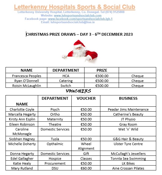We will have a table outside the canteen on Thursday 7th December to give out all of the prizes that have been drawn from Monday 4th to Thursday 7th December. This will be during lunch time from 12midday to 1pm.