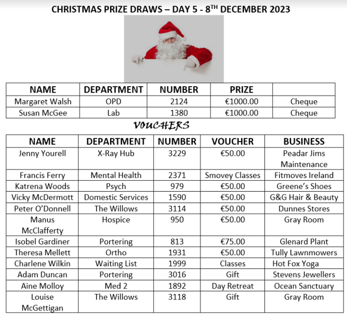 Congratulations to all of our prize winners. All of today prizes along with any prizes that are outstanding from the week can be collected from our table outside the canteen on Tuesday 12th December from 12md – 2pm. Posted by0860801074mDecember 8, 2023Posted inUncategorized Share this: Click to share on X (Opens in new window) X Click to share on Facebook (Opens in new window) Facebook Like Loading...