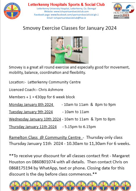 The next set of Smovey Exercise Classes are commencing on Monday 8th January 2024. See poster for further information and booking details. Posted by0860801074mJanuary 3, 2024Posted inUncategorized Share this: Click to share on X (Opens in new window) X Click to share on Facebook (Opens in new window) Facebook Like Loading...