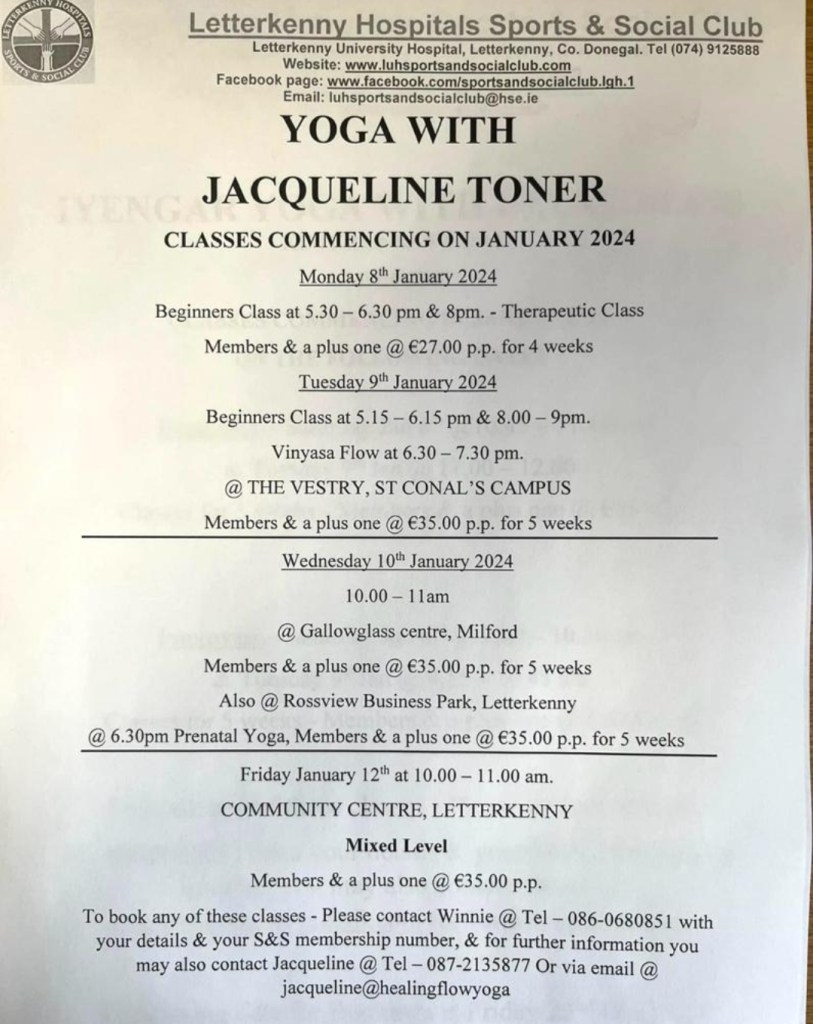 We have Yoga Classes restarting with Jacqueline Toner in January at the following venues. Please see poster attached with further information & booking details. Posted by0860801074mJanuary 3, 2024Posted inUncategorized Share this: Click to share on X (Opens in new window) X Click to share on Facebook (Opens in new window) Facebook Like Loading...