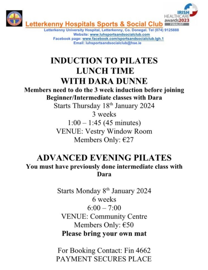 We will be starting up our Advanced Evening Pilates on Monday 9th January with Dara Dunne in the Community Centre, Letterkenny & also our lunchtime Pilates again with Dara Dunne starting on Thursday 18th January. Please see posters attached for further information & booking details.