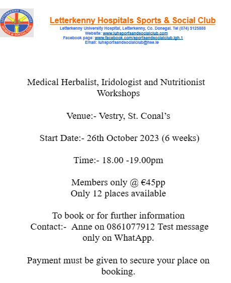 * Places available* The Medical Herbalist, Iridologist and Nutritionist Workshops are starting tomorrow evening, Thursday 11th January 2024, Its on from 6pm to 7pm in the Vestry, Letterkenny. A few places have become available because of cancellations, so if interested contact Anne on 0861077912 by test on WhatsApp. See the two posters attached for further information.