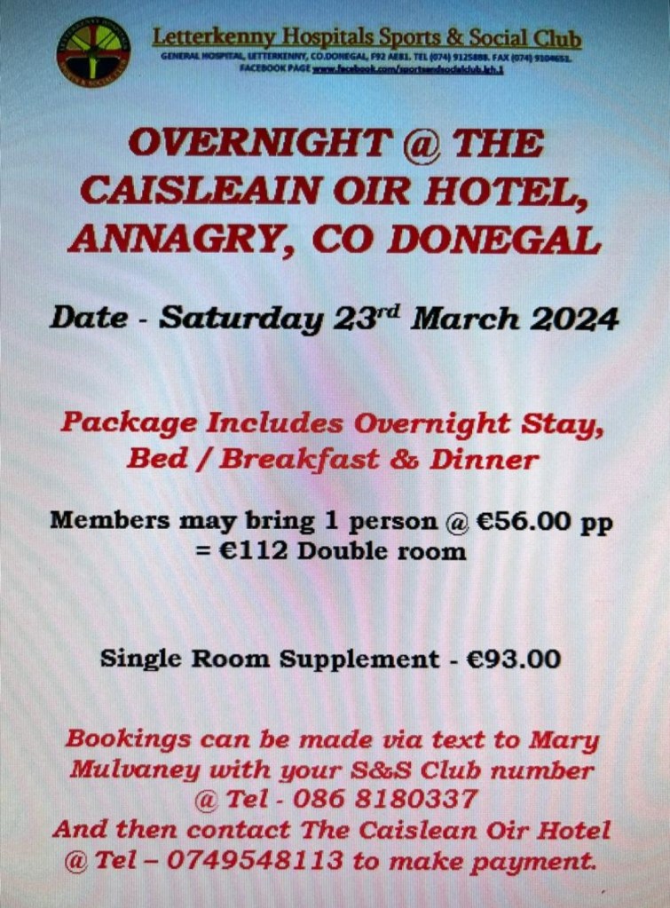 We have a excellent offer to Caisleain Oir Hotel, Annagry on Sat 23rd March 2024. Please see poster attached for further details & booking information. Please book early to avoid disappointment. Posted by0860801074mJanuary 10, 2024Posted inUncategorized Share this: Click to share on X (Opens in new window) X Click to share on Facebook (Opens in new window) Facebook Like Loading...