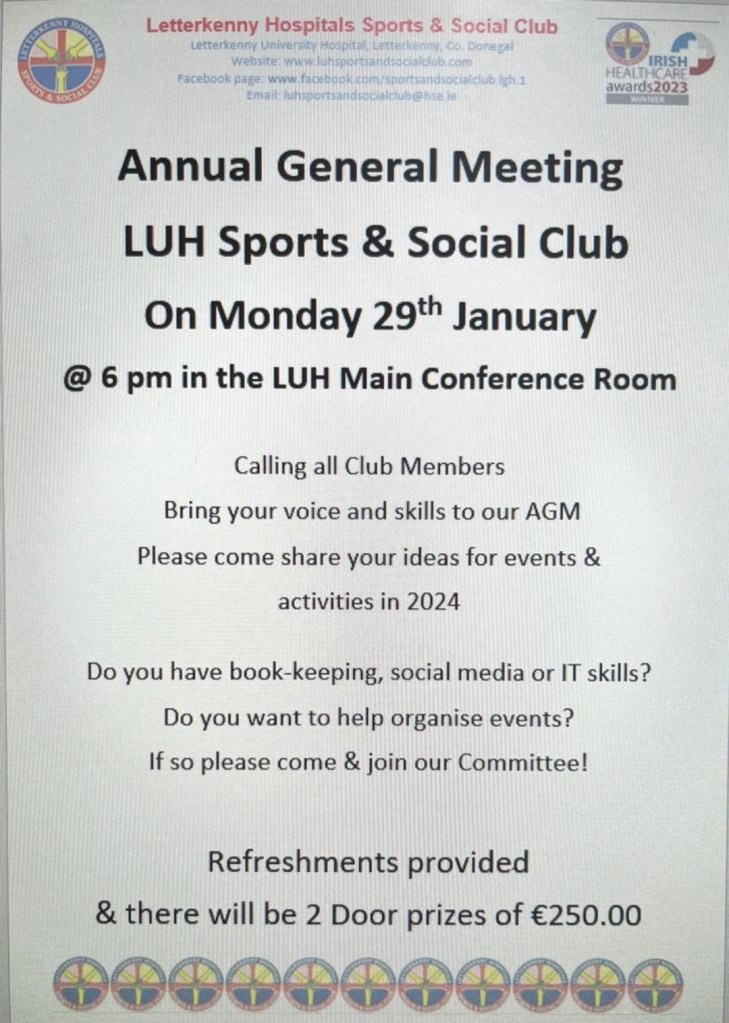 Our members love our Club but our Club needs a committee!!! Following the recent success of becoming a winner at the 2023 Irish HealthCare Awards & recognised for championing Wellbeing in the Workplace. The judges were very impressed with the wide variety of amazing events we had undertook as a voluntary group throughout the year. If you are interested in how the club operates, we are looking for NEW MEMBERS to please join, share your ideas and bring your skills to our very successful & evolving Letterkenny Hospital Sports and Social Club please see poster attached for further information on our AGM which is being held on Monday 29th January 2024 @ 6pm in the Main Conference Room, LUH.
