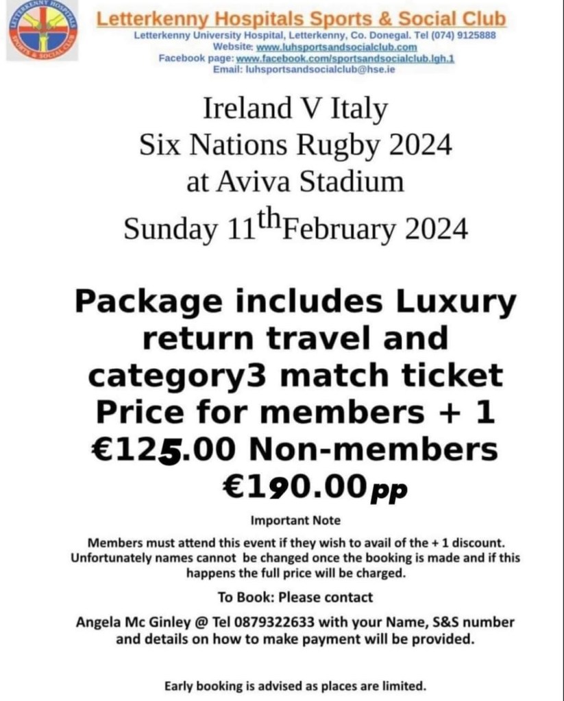 **We have spaces become available** For our Ireland V Italy Six Nations Rugby Game on Sunday 11th February 2024. Please see poster attached for further information & booking details. Payment secures your ticket. **CLOSING DATE/TIME IS FRIDAY 19th JANUARY @ 12md 2024. Contact Angela McGinley ASAP to avoid disappointment. Contact details on poster attached.