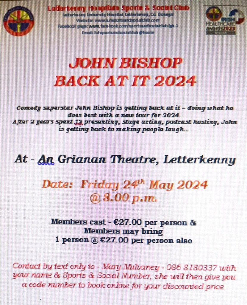 We have tickets available for John Bishop, An Grianan Theatre, Letterkenny. Please see poster attached with information & booking details. Please do not contact Mary Mulvaney until Sunday 11th until the tickets go live. Posted by0860801074mFebruary 9, 2024Posted inUncategorized Share this: Click to share on X (Opens in new window) X Click to share on Facebook (Opens in new window) Facebook Like Loading...