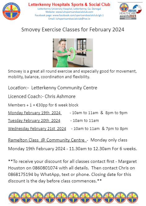 Our next course of Smovey Classes start next week. See poster for further information and details on how to book to receive your discount. Posted by0860801074mFebruary 12, 2024Posted inUncategorized Share this: Click to share on X (Opens in new window) X Click to share on Facebook (Opens in new window) Facebook Like Loading...