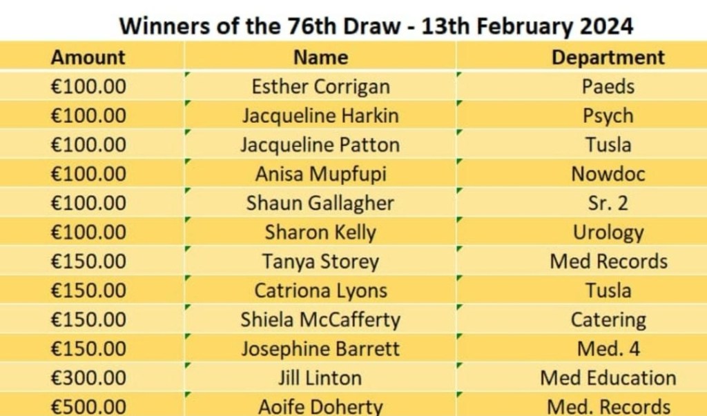 Congratulations to all of the winners of our February Draw 2024. Just to let everyone know that the winners may contact Grainne Sexton our new Treasurer for 2024 at the pharmacy department, LUH. Only contact between 3.30 – 5pm on a Wednesday or Thursday to collect your cheque. We would also like to take this opportunity to thank Bernie McGinty our outgoing Treasurer for all of her hard work over the last 2 years. Thanks Bernie.