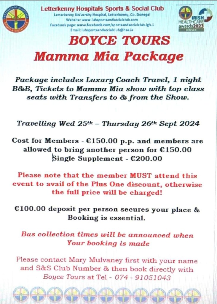 We have a Trip to Mamma Mia organised with Boyce Luxury Tours on Wed 25th, overnight in Dublin & Back on Thursday 26th Sept 2024. Please see poster attached for further information & booking details Posted by0860801074mFebruary 20, 2024Posted inUncategorized Share this: Click to share on X (Opens in new window) X Click to share on Facebook (Opens in new window) Facebook Like Loading...