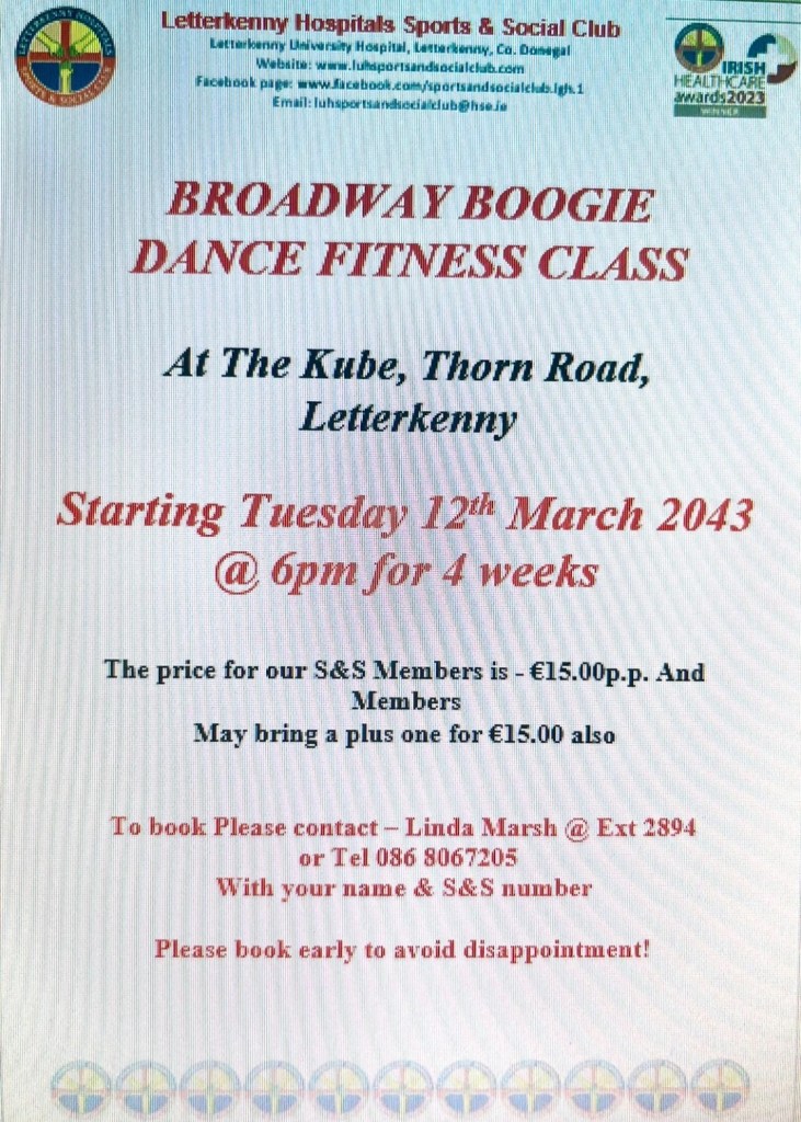 Our popular Broadway Boogie Dance Fitness Classes are back for 4 weeks starting on Tuesday 12th March. Please see poster attached for further information & booking details. Posted by0860801074mMarch 7, 2024Posted inUncategorized Share this: Click to share on X (Opens in new window) X Click to share on Facebook (Opens in new window) Facebook Like Loading...