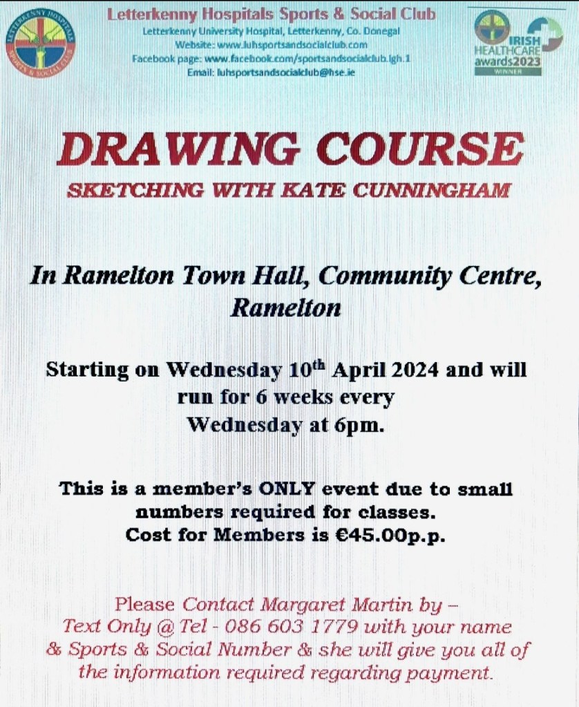 We have places available for a new Art Drawing Class starting on Wednesday 10th April in Ramelton Town Hall with Kate Cunningham. This class is for 6 weeks and will be for members only due to limited numbers. Please see poster attached for further information and booking details.