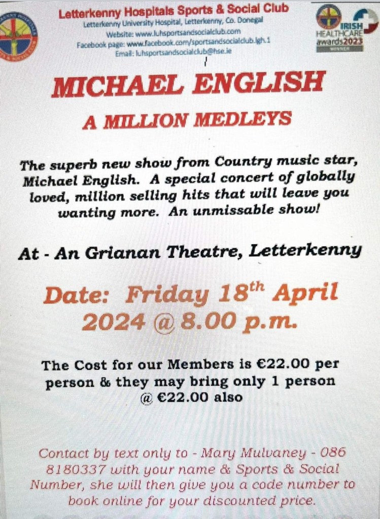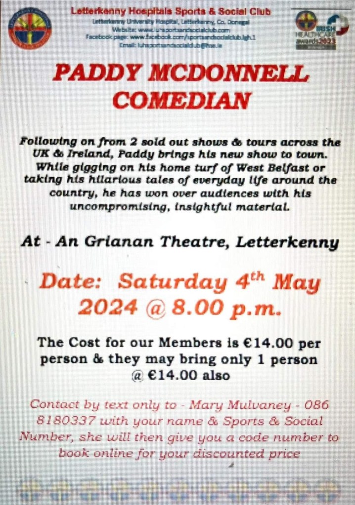 We have tickets available for 2 events at An Grianan Theatre -Michael English – A Million Medleys on Friday 18th April 2024 & Comedian Paddy McDonnell on Saturday 4th May 2024. Please see posters attached for further information & booking details. Posted by0860801074mMarch 25, 2024Posted inUncategorized Share this: Click to share on X (Opens in new window) X Click to share on Facebook (Opens in new window) Facebook Like Loading...
