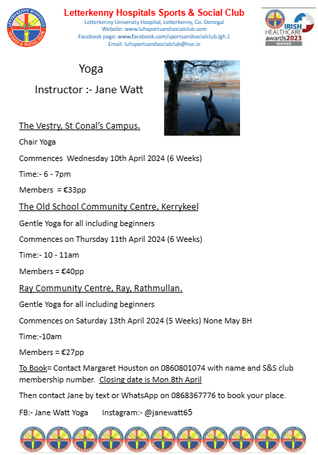 We have a new block of classes starting the week of 10th April with Instructor Jane Watt. Chair Yoga in the Vestry, Gentle Yoga for all including beginners in Kerrykeel & Ray Community Centre. See poster for further information and details on how to book.