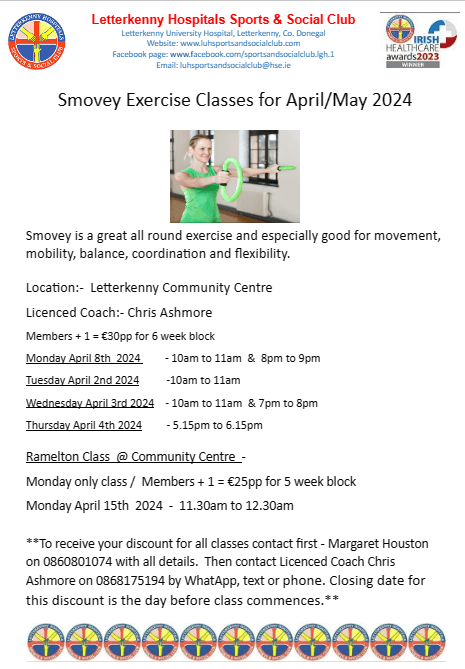 Our next course of Smovey Exercise Classes are starting……see poster attached for further information and details on how to book. Posted by0860801074mApril 2, 2024April 1, 2024Posted inUncategorized Share this: Click to share on X (Opens in new window) X Click to share on Facebook (Opens in new window) Facebook Like Loading...
