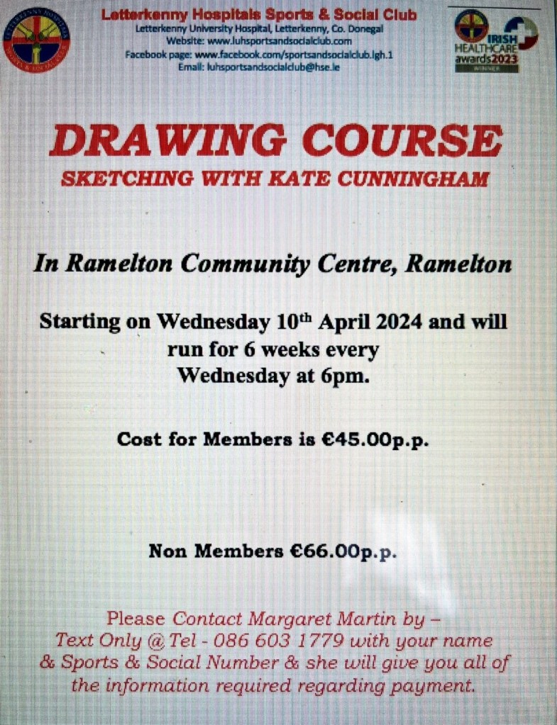 We have some places left for our Drawing & Sketching Classes in Ramelton, which start on Wednesday 10th April 2024. Please see poster attached for further information & booking details Posted by0860801074mApril 3, 2024Posted inUncategorized Share this: Click to share on X (Opens in new window) X Click to share on Facebook (Opens in new window) Facebook Like Loading...