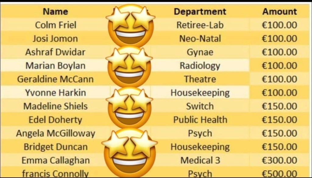 Congratulations to all of the winners of Our March Draw 2024. Just to let everyone know that the winners may contact Grainne Sexton our new Treasurer for 2024 at the Pharmacy Dept, LUH only between 3.30 – 5pm on Thursday or Friday to collect their cheque.