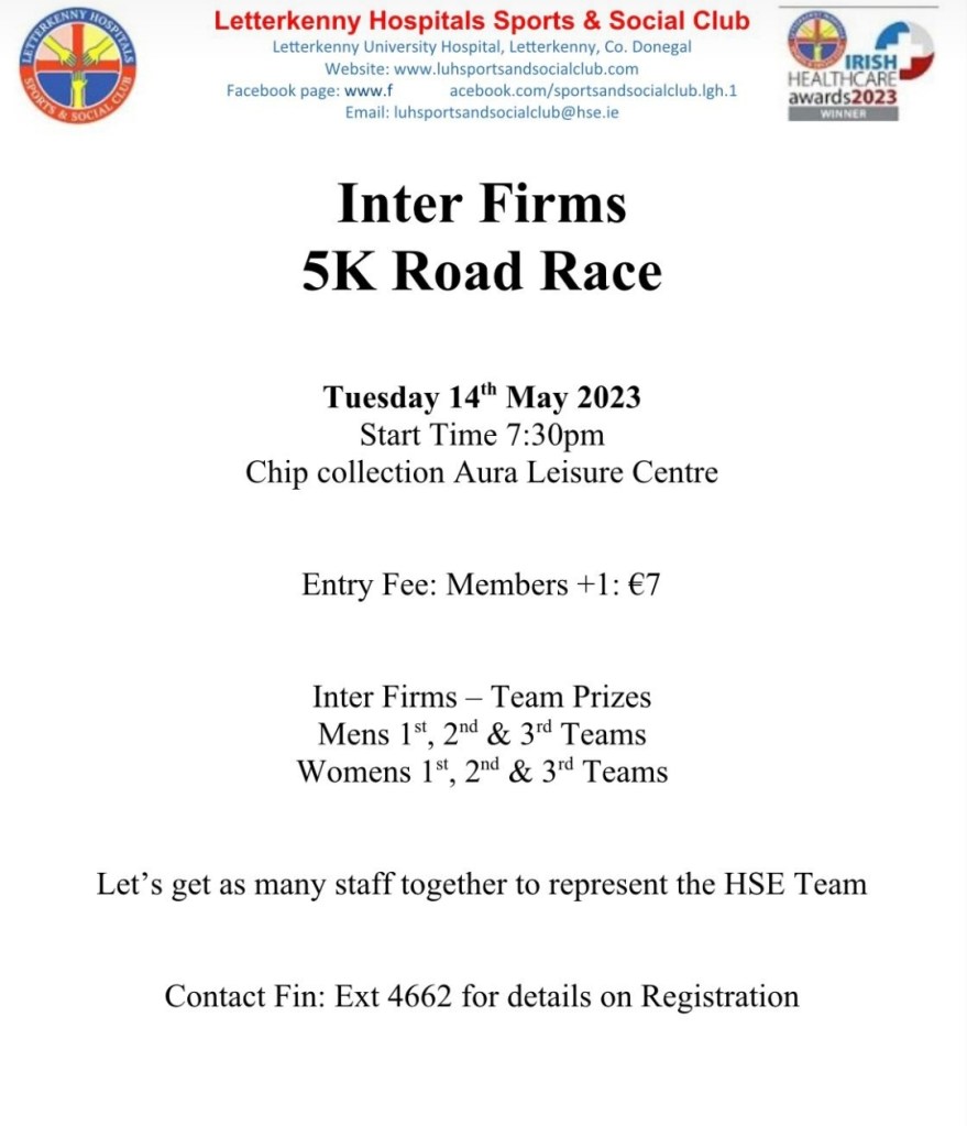 Let’s get as many staff together to represent the HSE. We will be offering Reduced Registration to our members for the next Road Race….The Inter Firms 5K on Tuesday 14th May 2024 @ 7.30pm. Please see poster attached for further information & booking details.