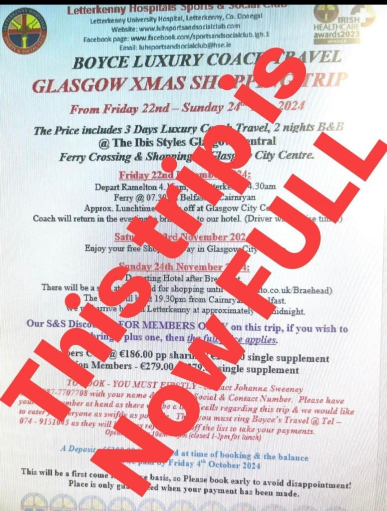 Just to let you all know that Our S&S trip to Glasgow is now FULL!. In the event of any cancellations i will post availability Posted by0860801074mApril 30, 2024Posted inUncategorized Share this: Click to share on X (Opens in new window) X Click to share on Facebook (Opens in new window) Facebook Like Loading...