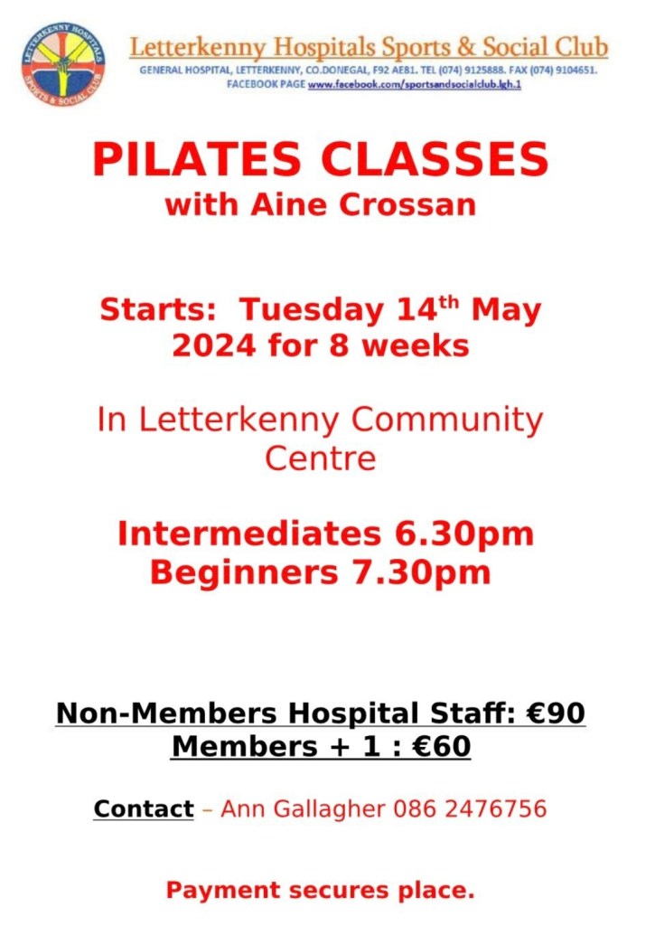We have Pilates Classes with Aine Crossan starting Tuesday 14th May for 8 weeks. Please see poster for Further information & booking details. Posted by0860801074mMay 1, 2024Posted inUncategorized Share this: Click to share on X (Opens in new window) X Click to share on Facebook (Opens in new window) Facebook Like Loading...