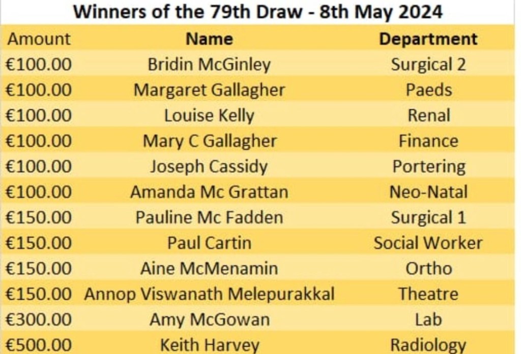 Congratulations to all of the winners of Our May Draw 2024. Just to let everyone know that the winners may contact Grainne Sexton our new Treasurer for 2024 at The Pharmacy Dept. LUH ONLY between 3.30 – 5pm on Thursday or Friday to collect their cheque or to make alternative arrangement’s