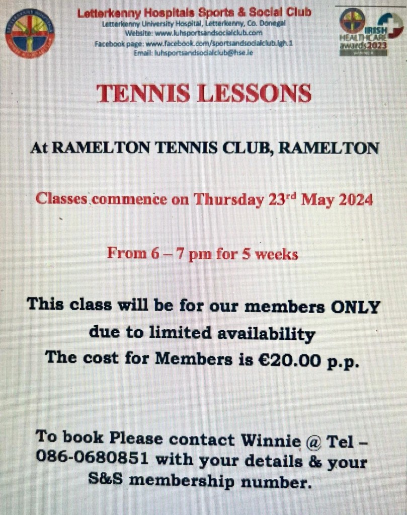 With the new film ‘Challengers’ in the cinema…. We are happy to announce we have Tennis Lessons available @ The Ramelton Tennis Club, starting on Thursday 23rd May 2024 for 5 weeks. Please see poster attached for further information & booking details.