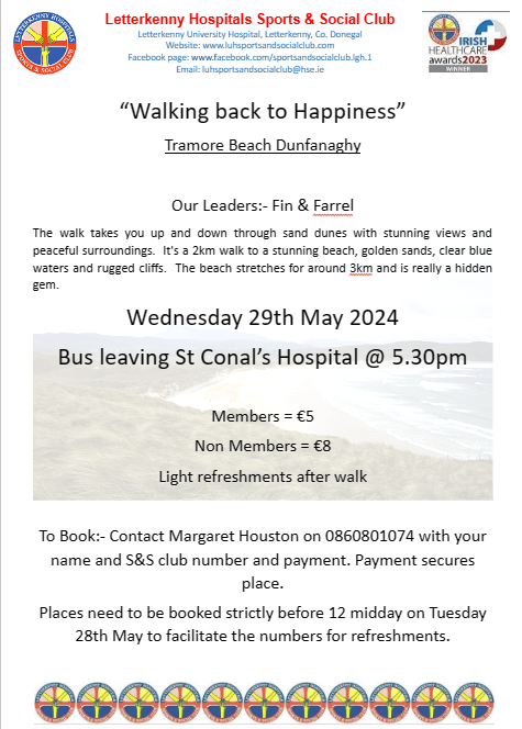 Our next walk is to The Tramore Beach in Dunfanaghy on the 29th May. See poster for further information and details. No booking will be taken after 12md on Tuesday 28th May, so book early to avoid any disappointed. Posted by0860801074mMay 17, 2024Posted inUncategorized Share this: Click to share on X (Opens in new window) X Click to share on Facebook (Opens in new window) Facebook Like Loading...