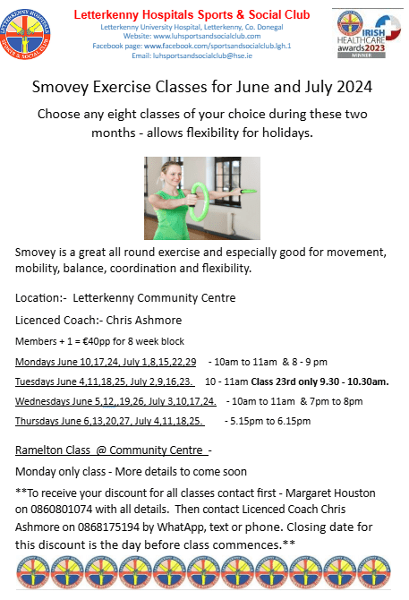 Our next set of Smovey Exercise classes for June & July 2024. You can choose any eight classes of your choice during these two months. Remember your + 1 must attend the same class as yourself the member. This is allowing flexibility for holidays. See poster for further information and details on how to book. Ramelton Class will be starting and details will follow soon.