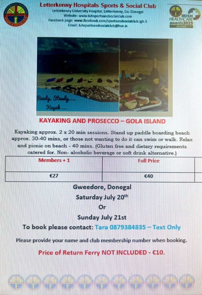 We have a kayaking & Prosecco trip to Gola island organised for 20th/21st July 2024. Please see poster attached for further information & booking details. Posted by0860801074mJune 5, 2024Posted inUncategorized Share this: Click to share on X (Opens in new window) X Click to share on Facebook (Opens in new window) Facebook Like Loading...