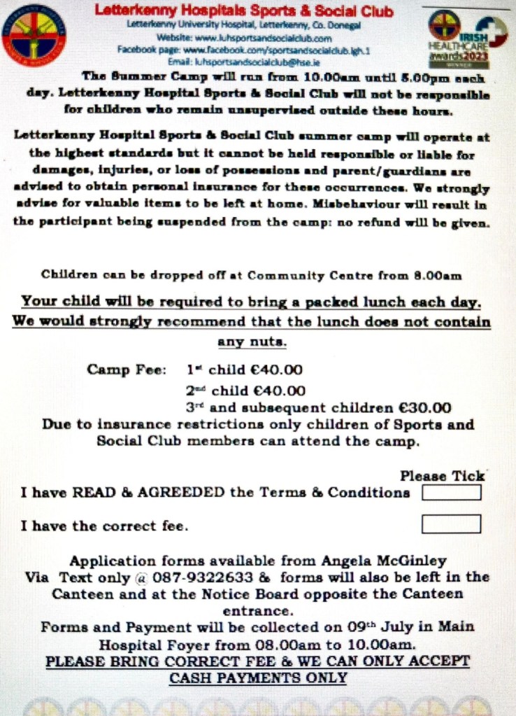 We are very pleased to announce the details for our Annual Sports & Social Children’s 3 day Summer Camp @ the Letterkenny Community Center which starts on Wed 14th – 16th August 2024. Please see posters attached for further information & booking details. To speed things up for you all, you can collect the application forms from today from our notice board outside the Canteen, in Canteen or off Angela McGinley @ number provided on poster. Please fill these forms out completely with all of the necessary questions answered. Registration with completed forms & payment will take place on Tuesday 9th July from 8am – 10am at our desk in the Foyer at the main door of the Hospital. We would ask you all to kindly bring the correct fee & just to let you know we can only accept cash payments as we have no contactless facility at our disposal. Please read all of the information provided as bookings will not be taken via any social Media Platforms. We would also ask you all to please book early to avoid Disappointment as this Camp fills up fairly quickly.