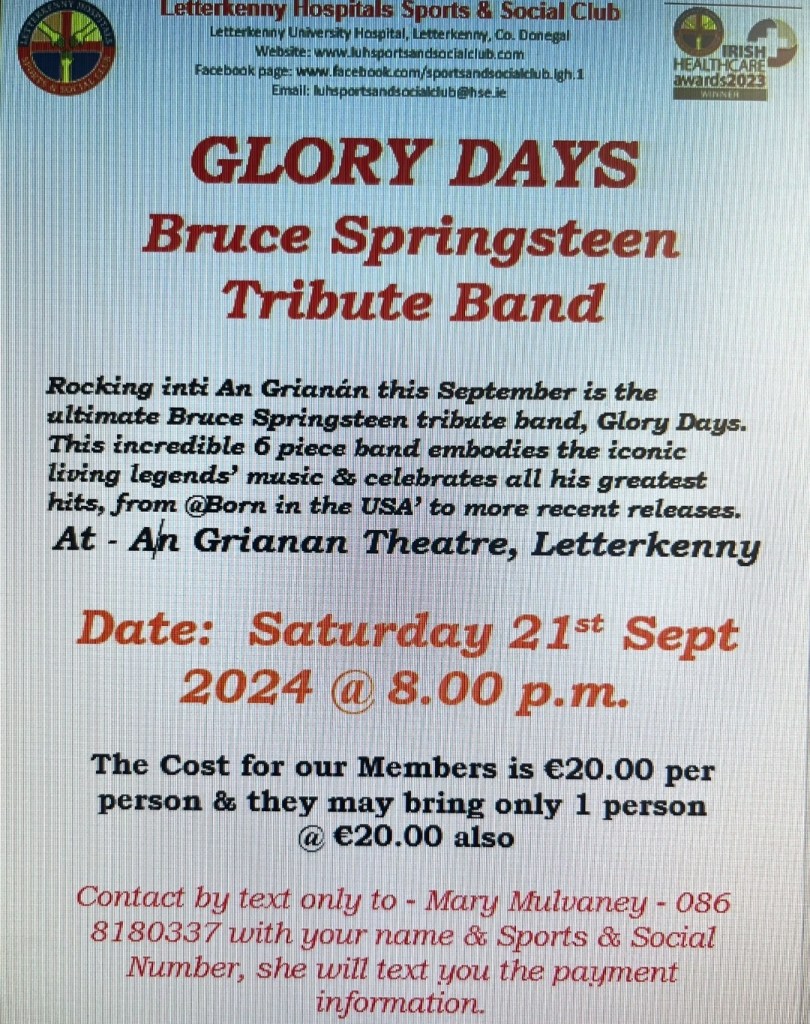 If there are any Bruce Springsteen fans among our members, we have tickets available for ‘Glory Days’ by the Bruce Springsteen Tribute Band. Please see poster attached for further information & booking details. Posted by0860801074mJuly 11, 2024Posted inUncategorized Share this: Click to share on X (Opens in new window) X Click to share on Facebook (Opens in new window) Facebook Like Loading...