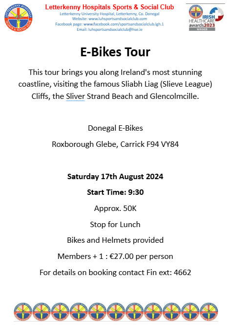 We have another of our popular E-Bike Tours, this time along the south of the county, covering Sliabh League, Silver Strand Beach & Glencolmcille. Please see poster for further information & booking details. Posted by0860801074mAugust 2, 2024Posted inUncategorized Share this: Click to share on X (Opens in new window) X Click to share on Facebook (Opens in new window) Facebook Like Loading...