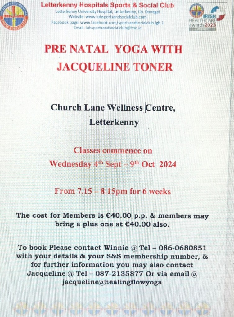 Jacqueline has a new Venue for her Pre Natal Yoga @ The Church Lane Wellness Centre, starting Wednesday 4th September for 6 weeks. Please see poster attached for further details & booking information. Posted by0860801074mSeptember 1, 2024Posted inUncategorized Share this: Click to share on X (Opens in new window) X Click to share on Facebook (Opens in new window) Facebook Like Loading...