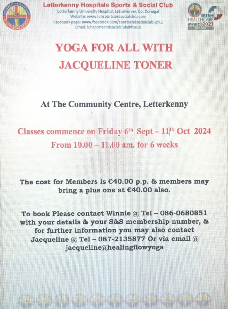 We have Yoga for all with Jacqueline Toner @ The Community Centre starting Friday 6th September 2024. Please see poster attached for further information & booking details. Posted by0860801074mSeptember 1, 2024Posted inUncategorized Share this: Click to share on X (Opens in new window) X Click to share on Facebook (Opens in new window) Facebook Like Loading...