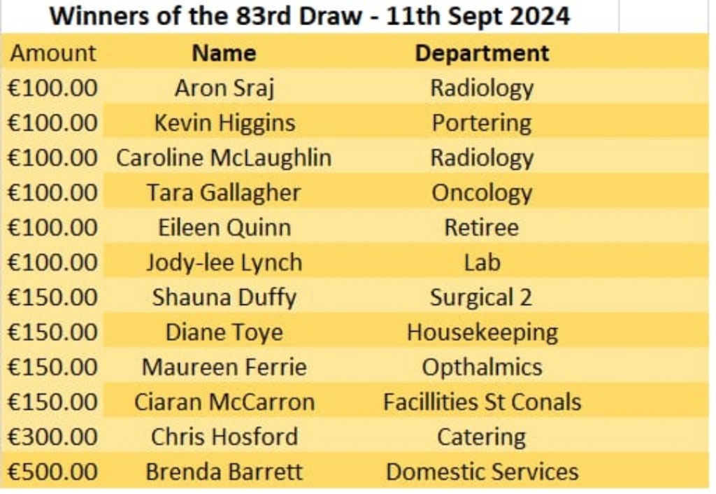 Congratulations to all of the winners of our Draw for September 2024. Just to let you all know that the winners may contact Grainne Sexton at Ext 3551 or grainne.sexton1@hse.ie to collect their cheque or to make alternative arrangements. Posted by0860801074mSeptember 11, 2024Posted inUncategorized Share this: Click to share on X (Opens in new window) X Click to share on Facebook (Opens in new window) Facebook Like Loading...