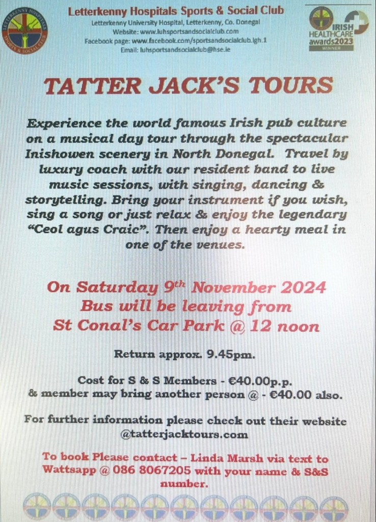 We have a new one day bus tour with Tatter Jack Tours Travelling round Inishowen, stopping off at a few Irish pubs experiencing the Ceol agus Craic. Please see poster attached for further information & booking details…… Posted by0860801074mSeptember 24, 2024Posted inUncategorized Share this: Click to share on X (Opens in new window) X Click to share on Facebook (Opens in new window) Facebook Like Loading...