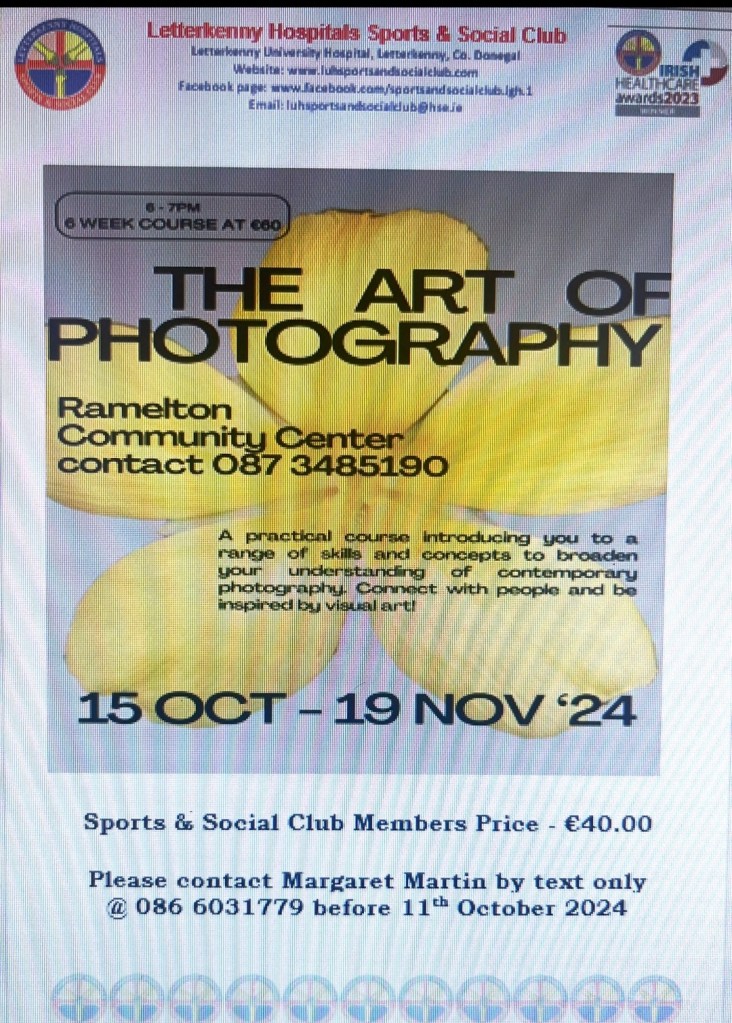 We have a new class starting in Ramelton Community Centre. The Art of Photography for 6 weeks. Please see poster attached for further information & booking details. Posted by0860801074mOctober 3, 2024Posted inUncategorized Share this: Click to share on X (Opens in new window) X Click to share on Facebook (Opens in new window) Facebook Like Loading...