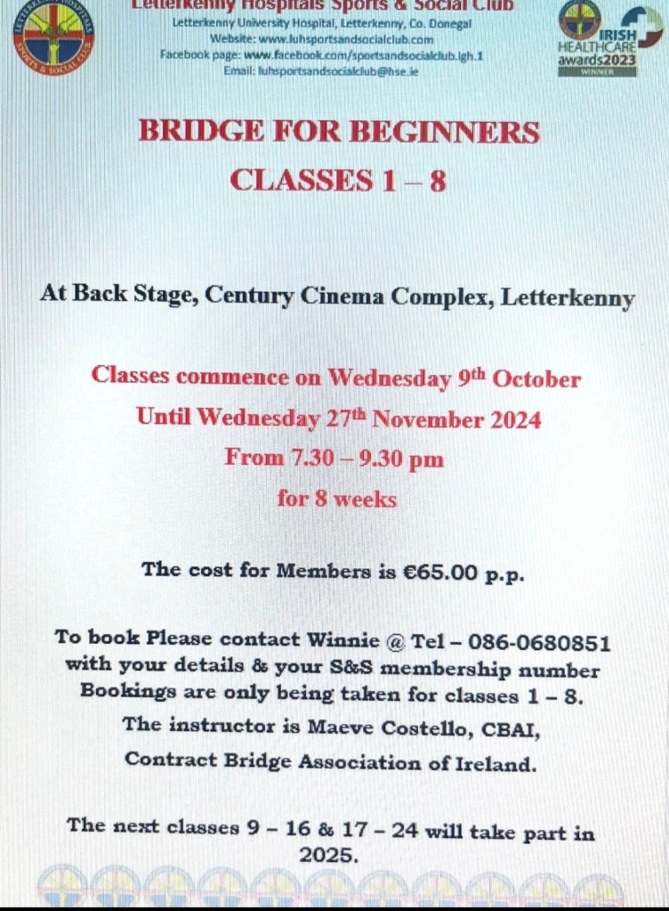 Just to remind everyone that we have Bridge Classes for beginners. Commencing this Wednesday 9th October @ 7.30pm at Backstage, Century Cinema, Letterkenny. Please see poster for further information and booking details. Posted by0860801074mOctober 7, 2024Posted inUncategorized Share this: Click to share on X (Opens in new window) X Click to share on Facebook (Opens in new window) Facebook Like Loading...