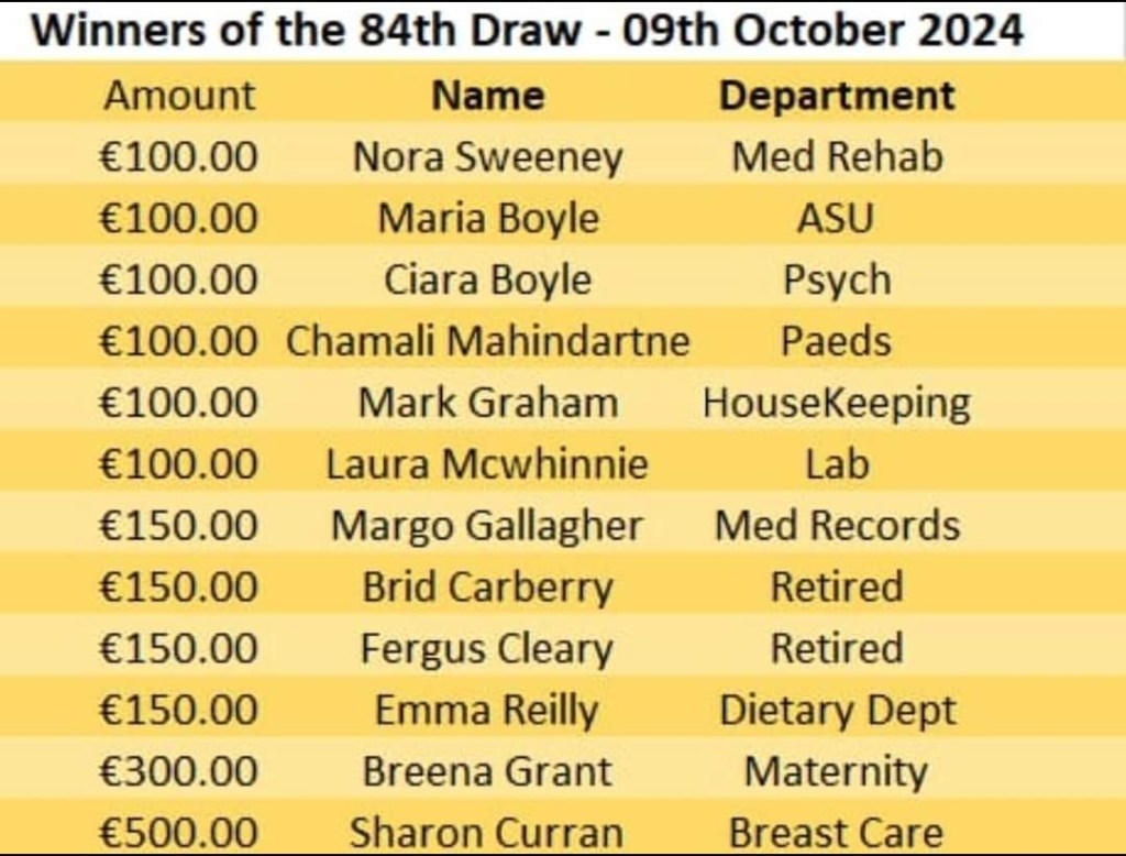 Congratulations to all of the winners of our Draw for October 2024. Just to let everyone know that the winners may contact Grainne Sexton at Ext 3551 or grainne.sexton1@hse.ie to collect their cheque or to make alternative arrangements. Posted by0860801074mOctober 9, 2024Posted inUncategorized Share this: Click to share on X (Opens in new window) X Click to share on Facebook (Opens in new window) Facebook Like Loading...