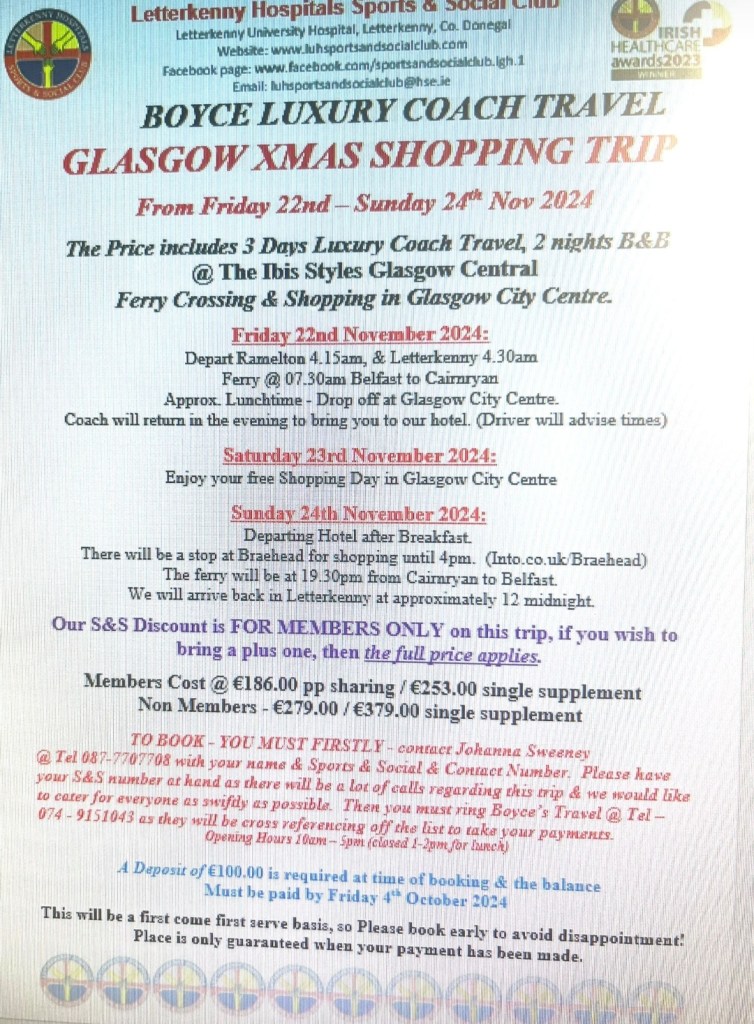 We have had a few spaces left for our Christmas Shopping Trip organised to Glasgow City Centre with Boyces Luxury Coach Travel from Friday 22nd Nov, returning Sunday night 24th Nov 2024…This includes coach transfer, Ferry crossings, 2 nights B&B @ The IBIS Styles Glasgow Central, with stop off at Braehead Shopping Ctr. on return trip home. Please see poster attached for all of the information & booking details. This discount on this trip is for our S&S members ONLY €186.00pp sharing €253.00 single supplement. Non Members – €279.00/€379.00 single. If you are interested can you please contact me at the number given below with our Name, S&S number & contact telephone number and only then contact Boyce Travel at the number below. Please have your S&S numbers available when booking.