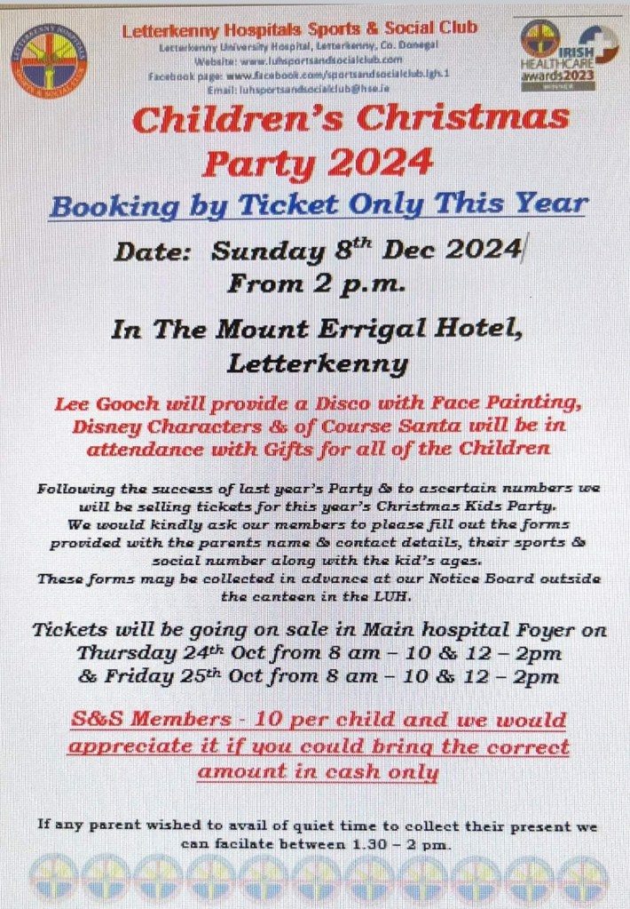Just to remind you all that it’s Booking by Ticket only !!!! for this years Kids Christmas Party 2024. Please see poster attached for further information. Tickets will go on sale this Thursday 24th from 8am – 10am & 12 – 2pm in the Main Hospital Foyer. We would appreciate if you could bring the correct amount of Cash also….Thank you