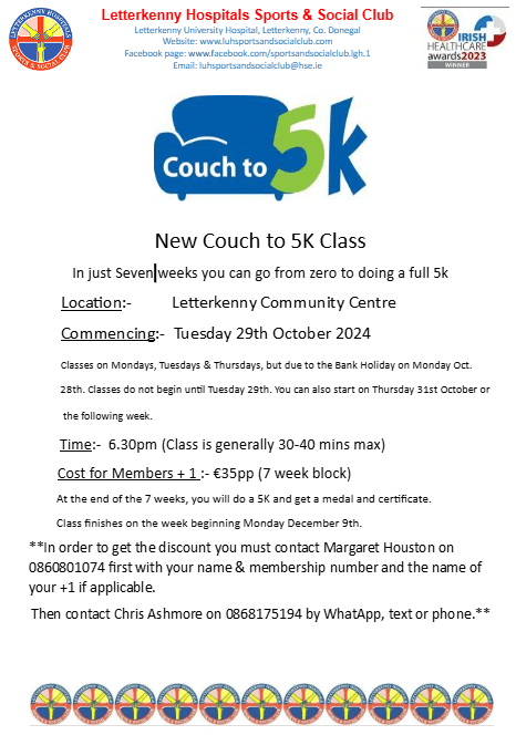 Our next Couch to 5K is starting again on Tuesday 29th October 2024. See poster for further information and details on how to book. Posted by0860801074mOctober 24, 2024Posted inUncategorized Share this: Click to share on X (Opens in new window) X Click to share on Facebook (Opens in new window) Facebook Like Loading...
