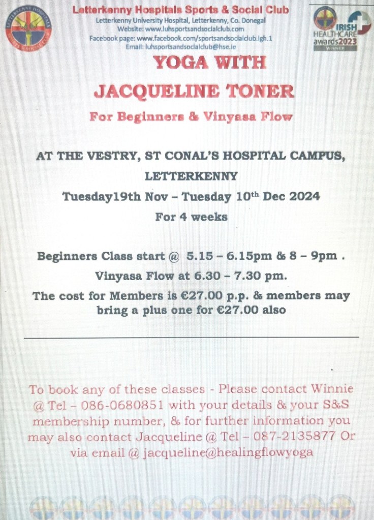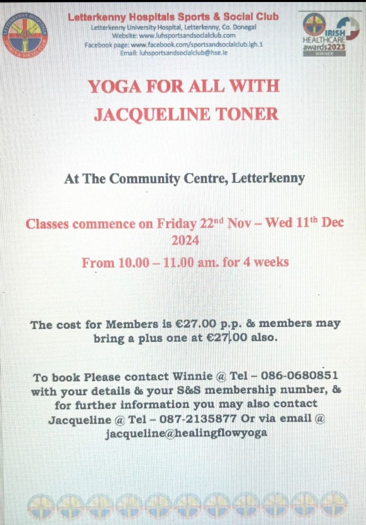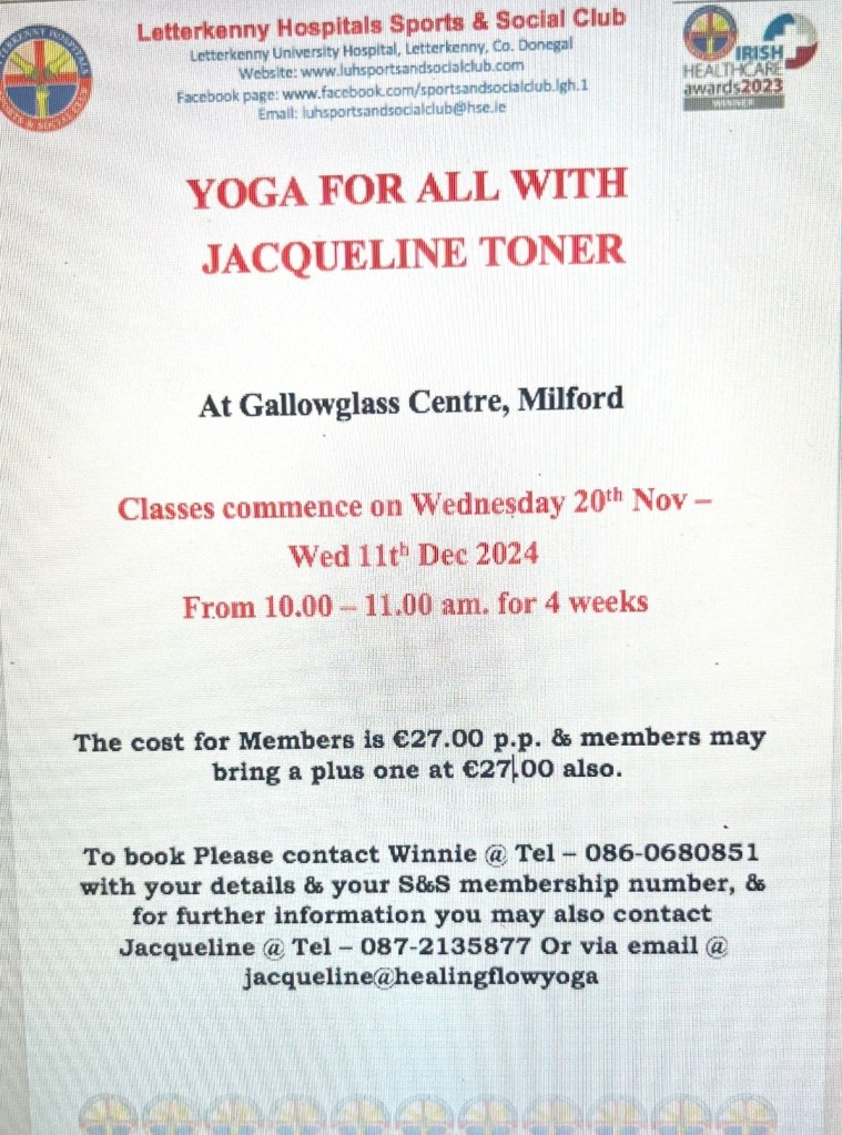 We have a selection of Yoga Classes with Jacqueline Toner restarting in the various locations as mentioned in the posters below. Please see posters attached for further information & booking details. Posted by0860801074mNovember 7, 2024Posted inUncategorized Share this: Click to share on X (Opens in new window) X Click to share on Facebook (Opens in new window) Facebook Like Loading...