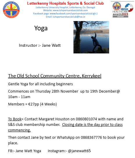 Yoga with Jane Watt in Kerrykeel. See Poster for further information and details on how to book. Posted by0860801074mNovember 17, 2024Posted inUncategorized Share this: Click to share on X (Opens in new window) X Click to share on Facebook (Opens in new window) Facebook Like Loading...
