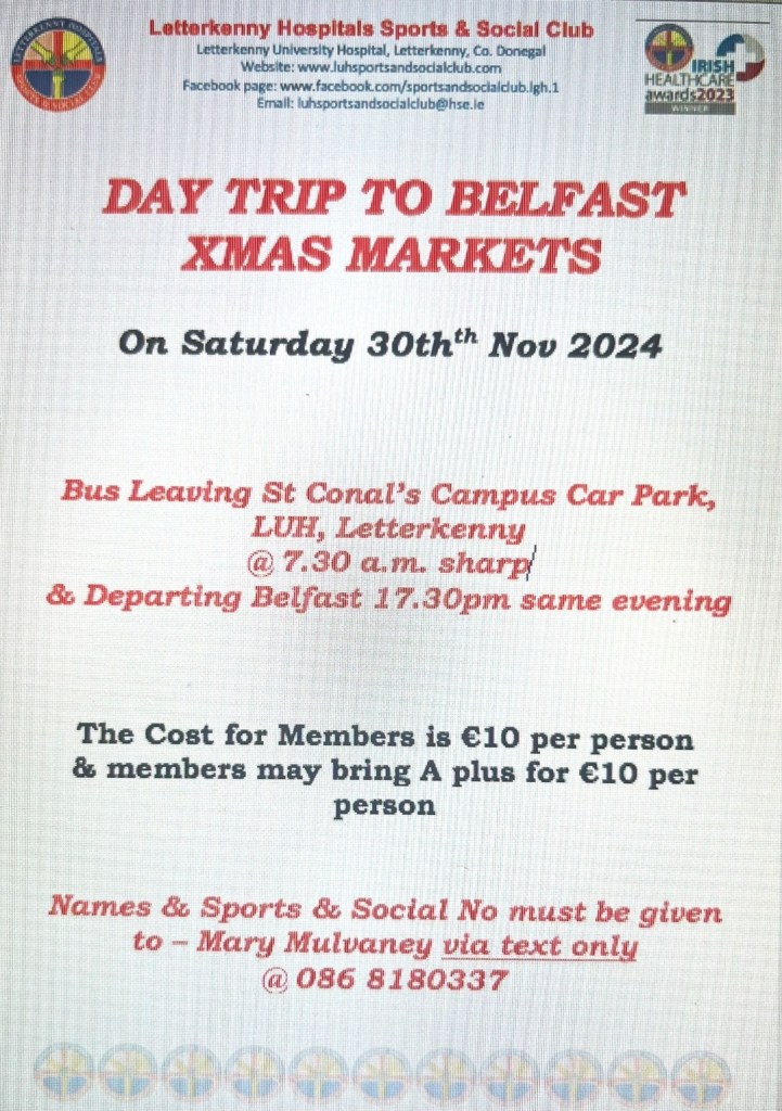 A few spaces have become available for our trip to Belfast Christmas markets on Saturday 30th November. Please contact Mary at the number on the poster to book your space. Thanks. Posted by0860801074mNovember 27, 2024Posted inUncategorized Share this: Click to share on X (Opens in new window) X Click to share on Facebook (Opens in new window) Facebook Like Loading...