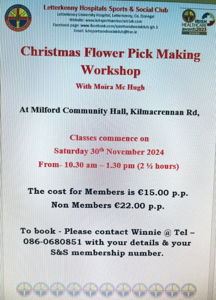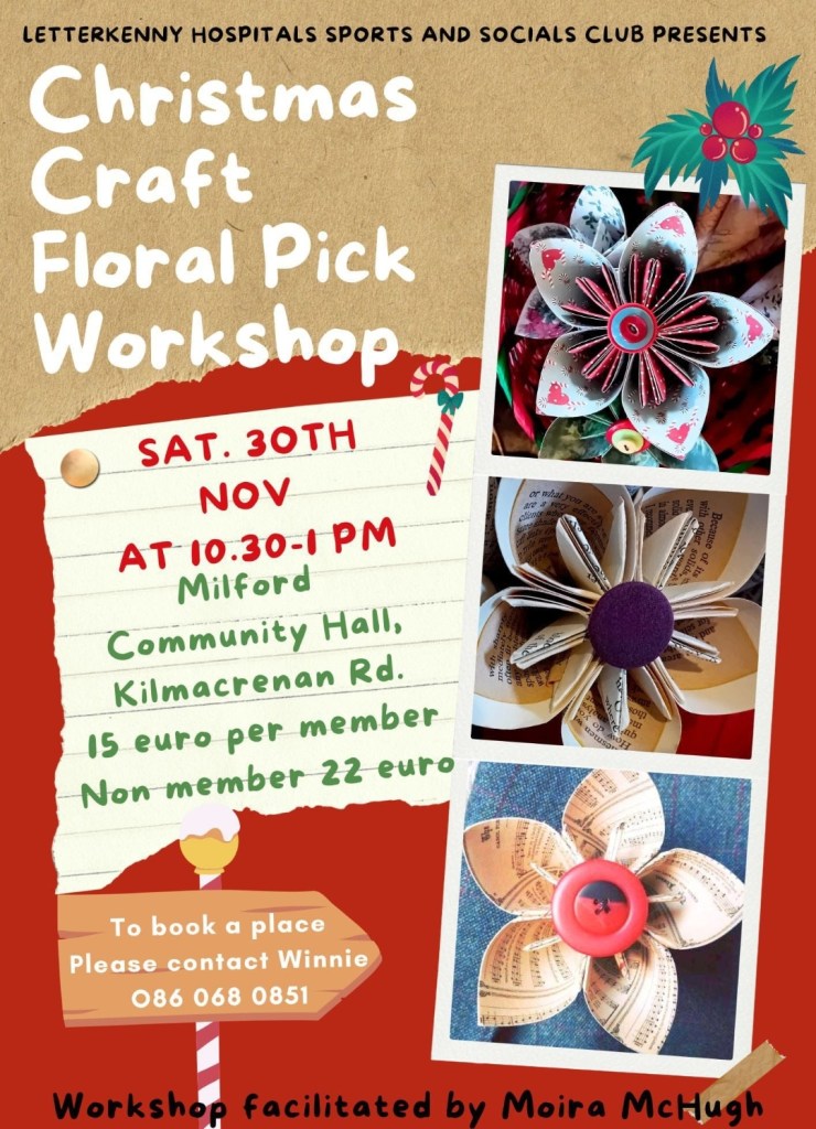 We have a lovely new class called The Christmas Flower Pick Making Workshop with Moira McHugh. This class will be on Saturday 30th Nov from 10.30 to 1.30pm. Cost for our members is €15pp and non members €22pp. The 2nd poster shows an example of the lovely decorations that can be made on the day, and all supplies are included in the price. Please book early to avoid disappointment.